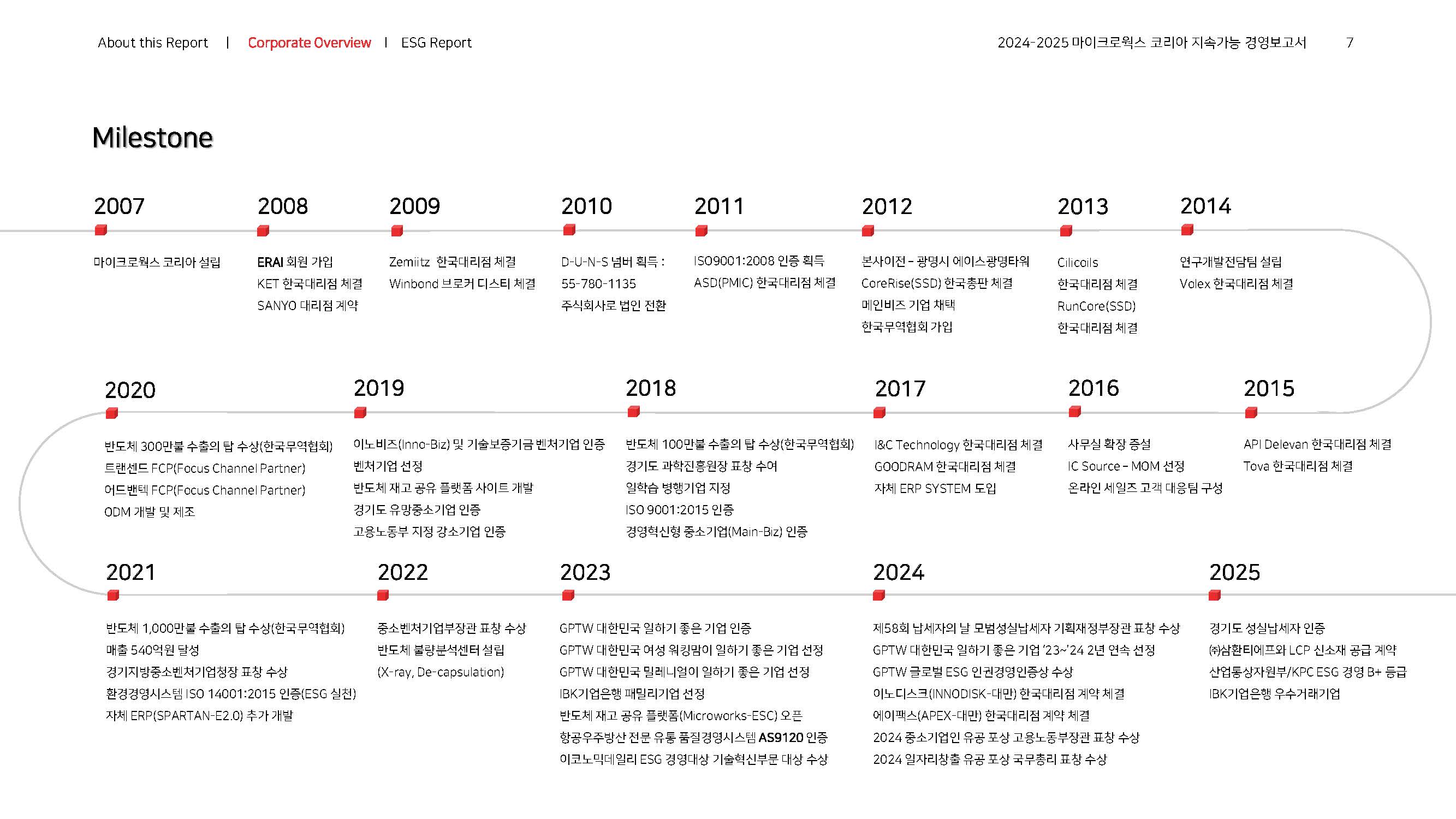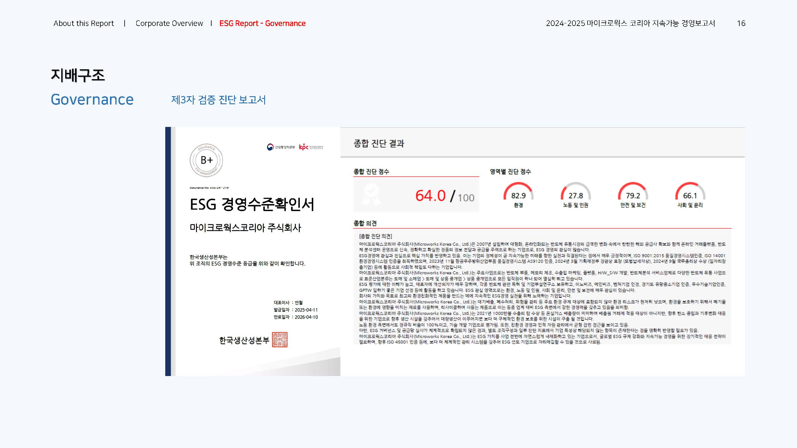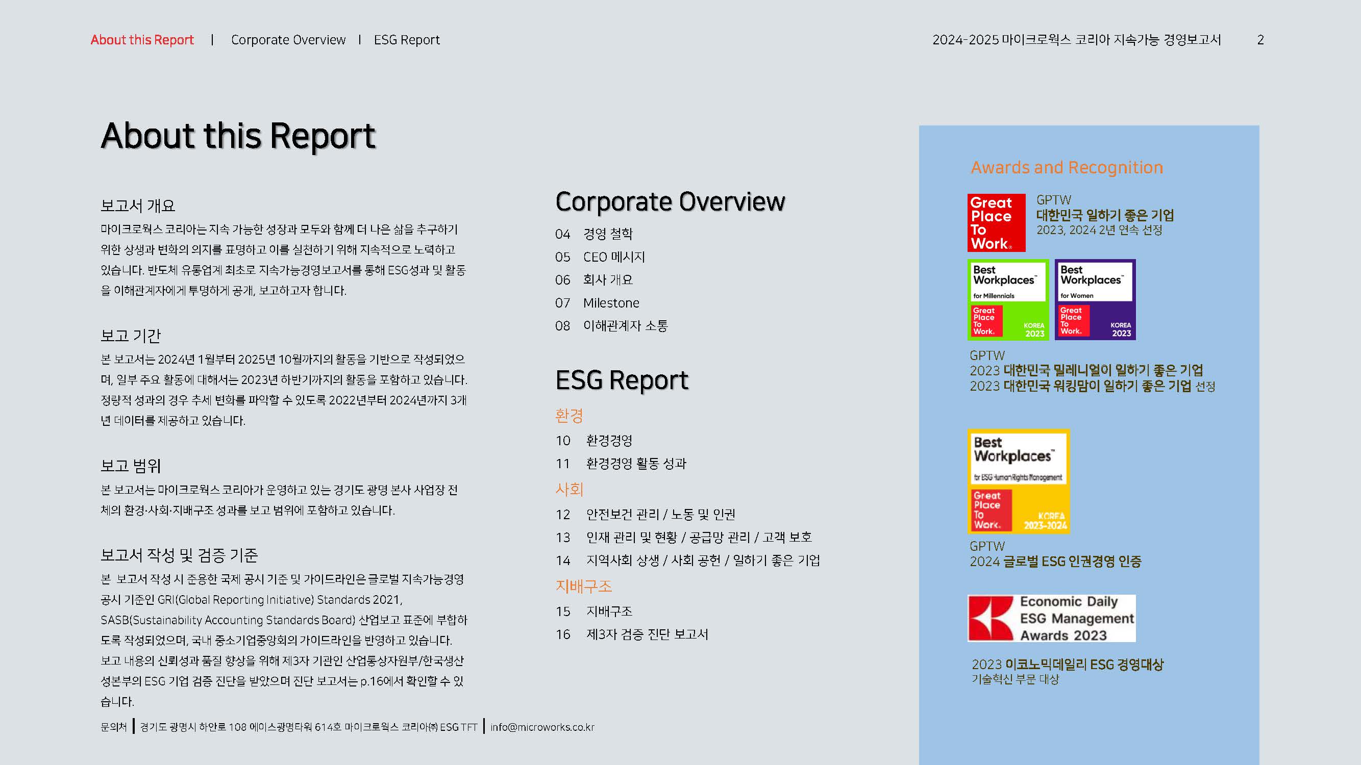 이에 마이크로웍스 코리아는 동종업계 최초로 ESG 정보 공시, 지속가능경영보고서를 발간하여