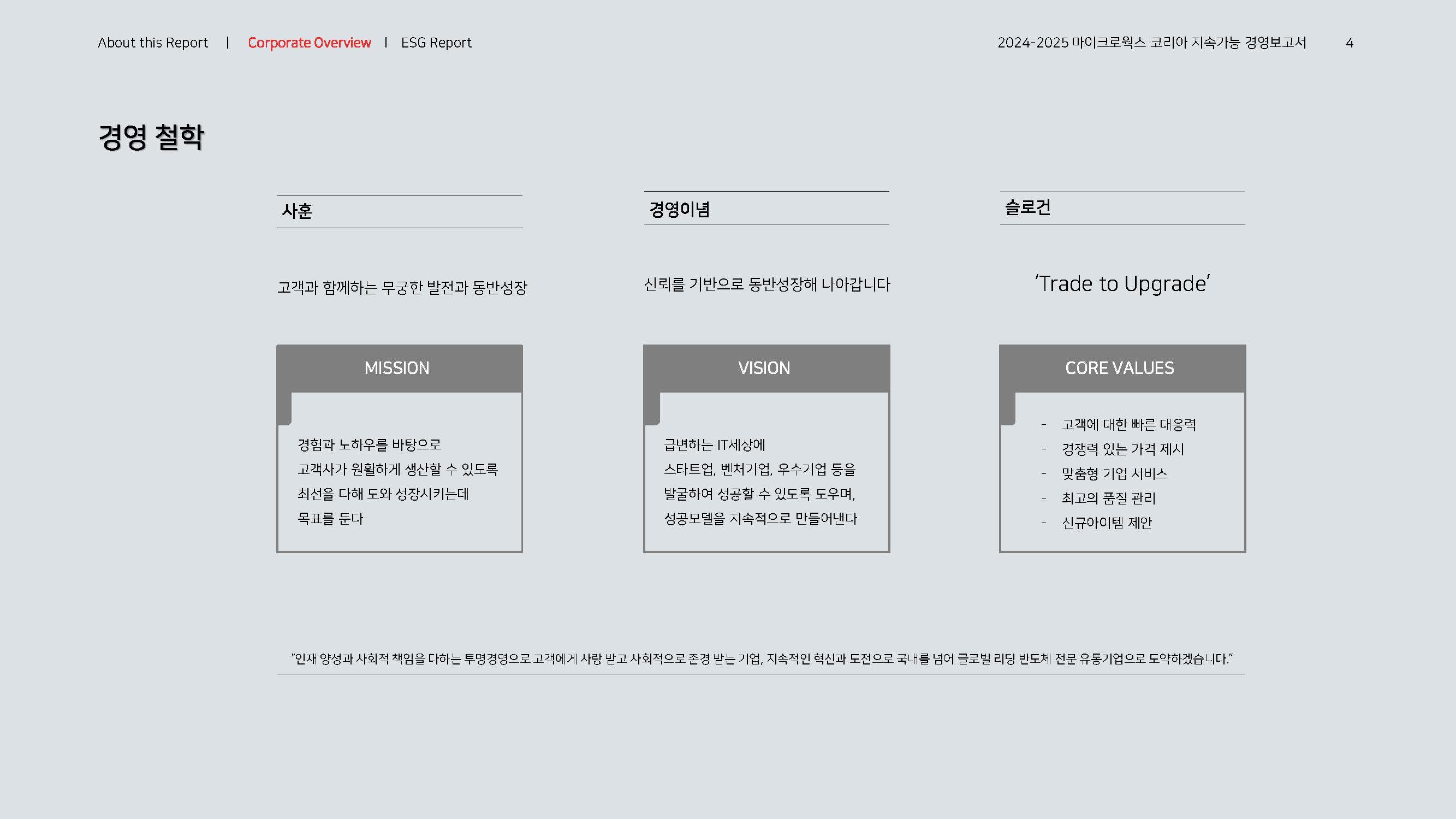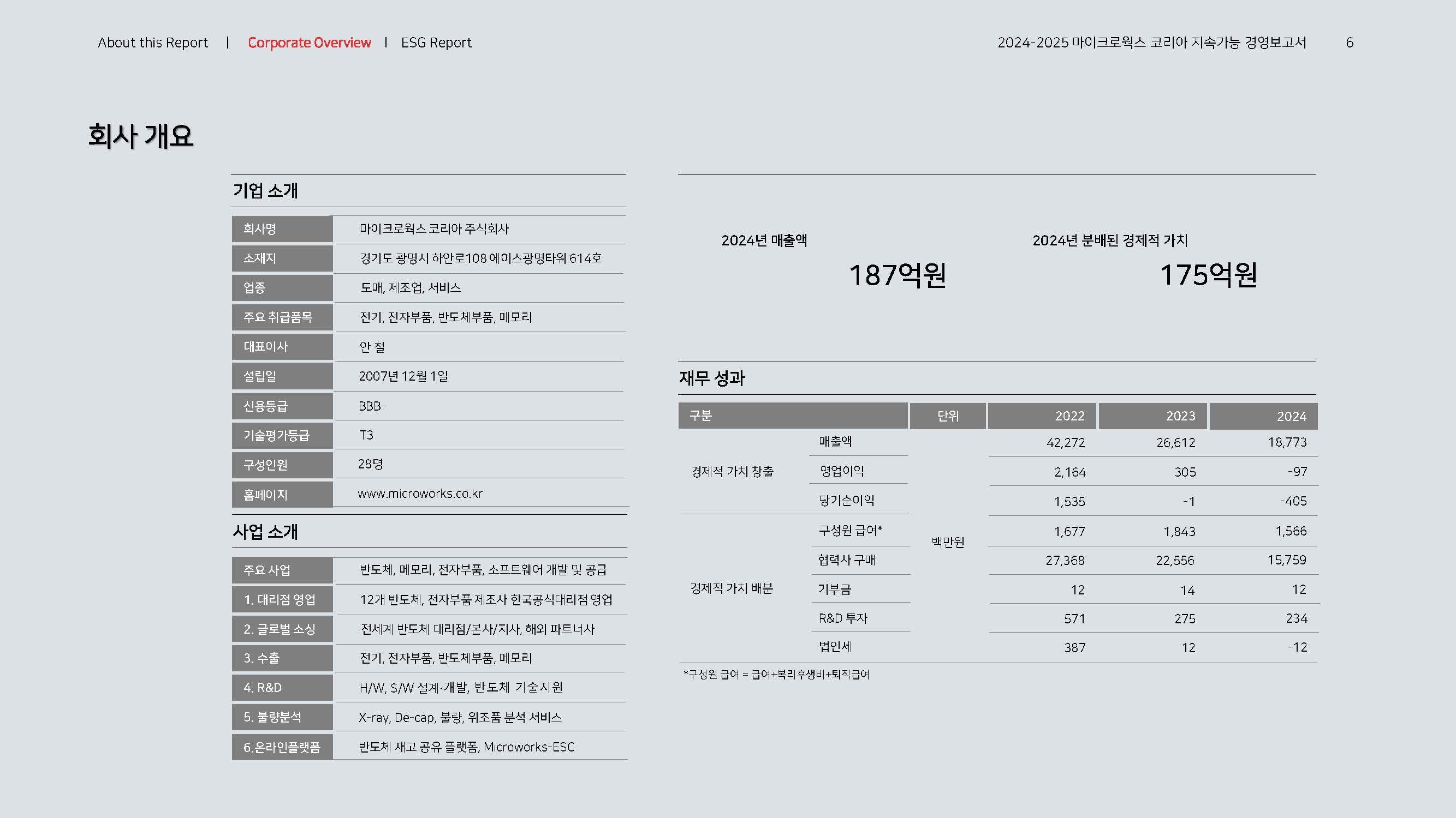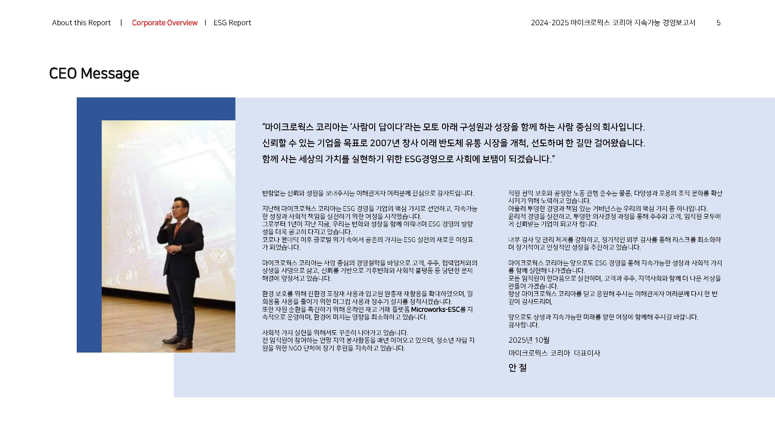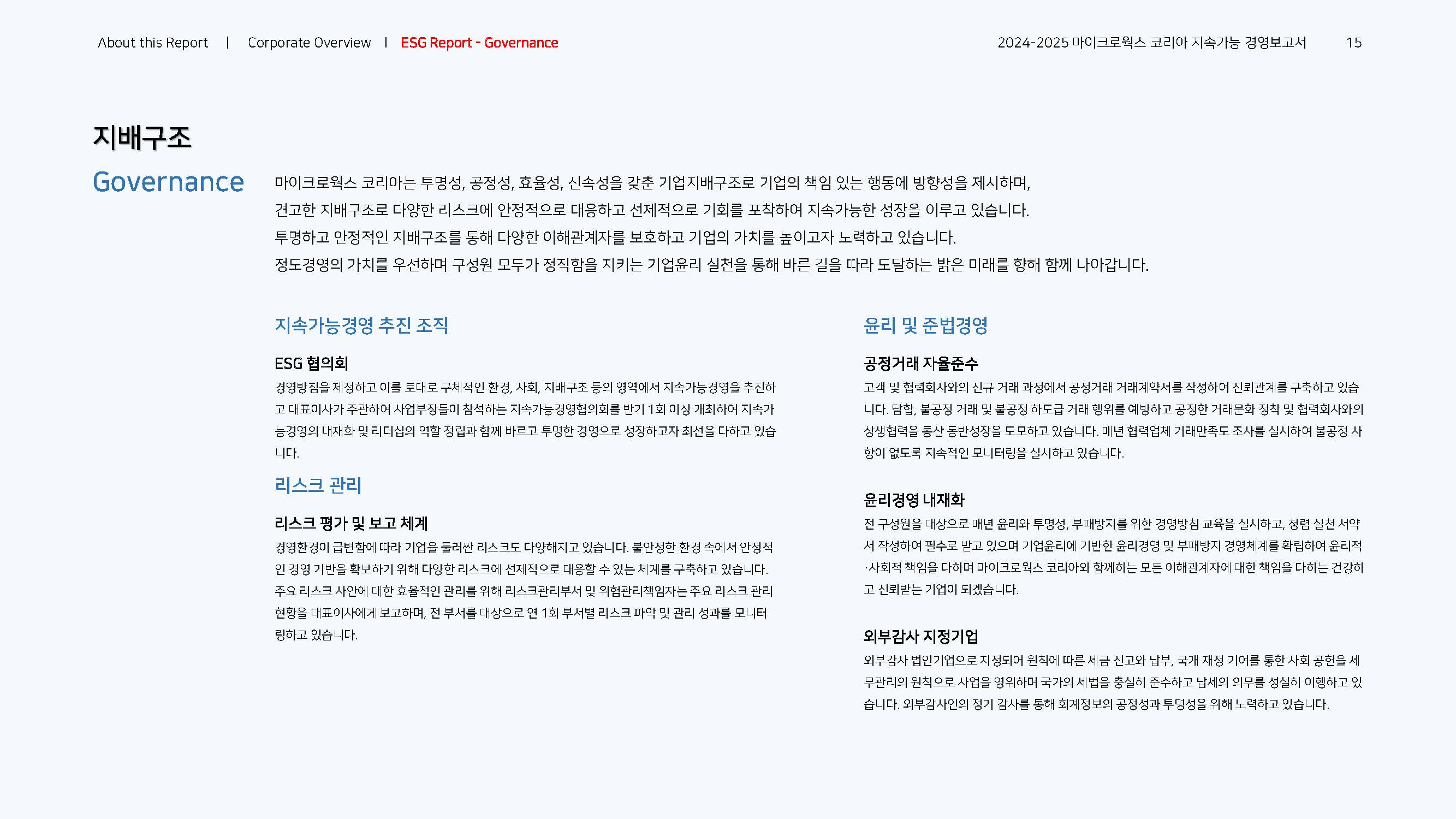 이에 마이크로웍스 코리아는 동종업계 최초로 ESG 정보 공시, 지속가능경영보고서를 발간하여